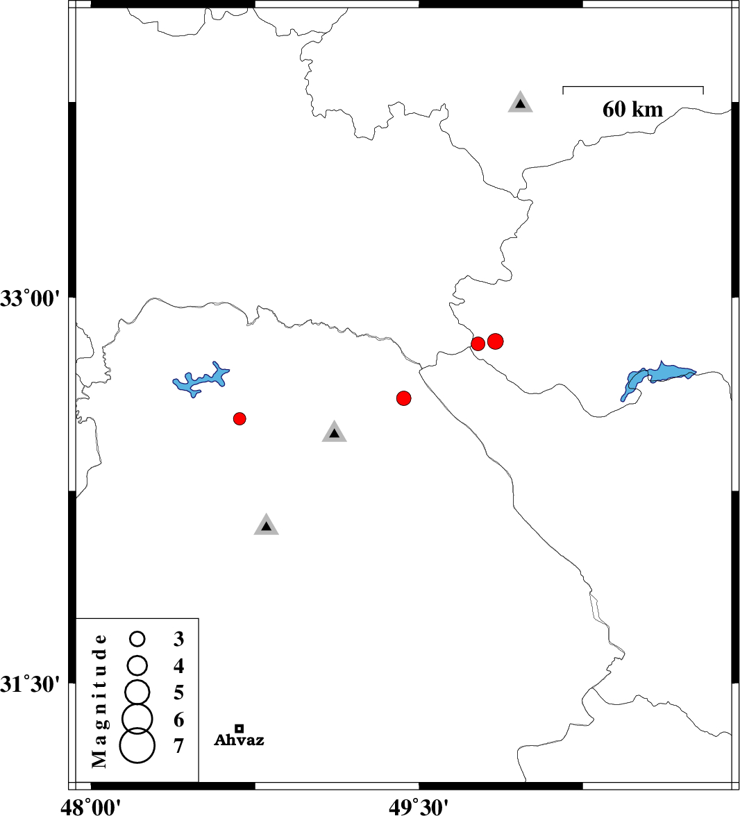 | 2012/06/06 | 01:44:25.7 | 06:14:25.7 | 32.53 | 48.68 | 14 | ML2.6 | Khoozestan Province, 32 km East of Andimeshk |