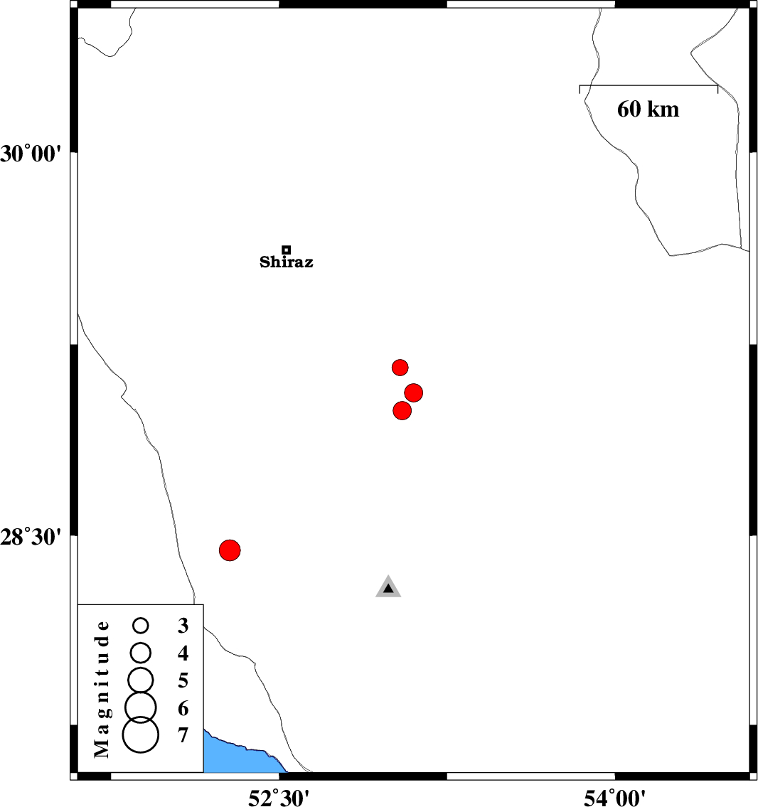 | 2012/05/30 | 06:55:44.7 | 11:25:44.7 | 28.44 | 52.28 | 37 | ML4.3 | Fars Province, 51 km South-East of Farashband |