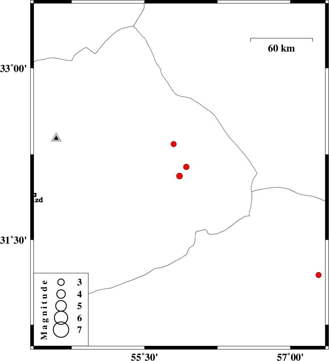 | 2012/06/13 | 05:43:52.3 | 10:13:52.3 | 31.19 | 57.29 | 14 | ML2.5 | Kerman Province, 46 km East of Ravar | ||