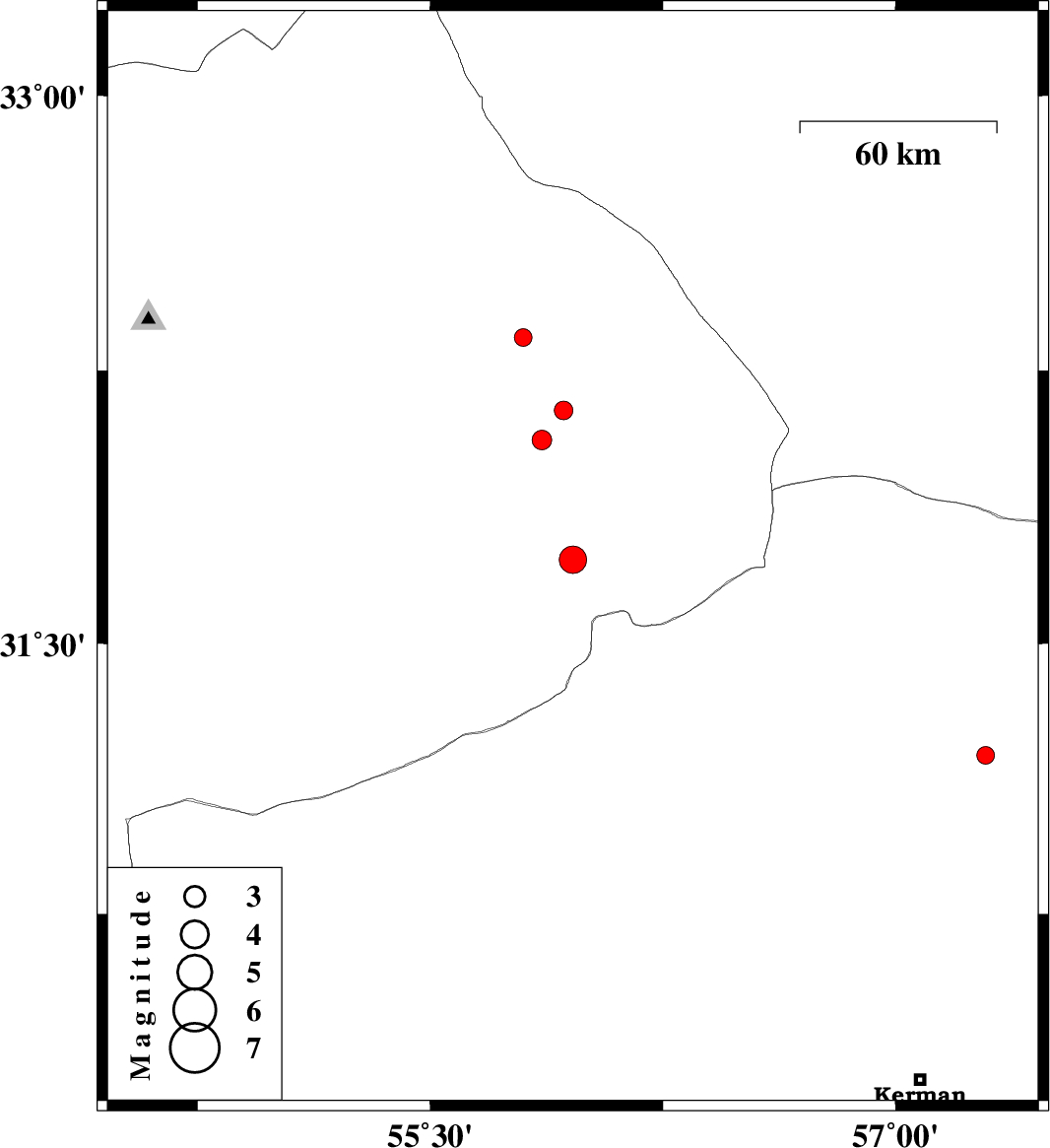 | 2012/06/13 | 05:43:52.3 | 10:13:52.3 | 31.19 | 57.29 | 14 | ML2.5 | Kerman Province, 46 km East of Ravar | ||