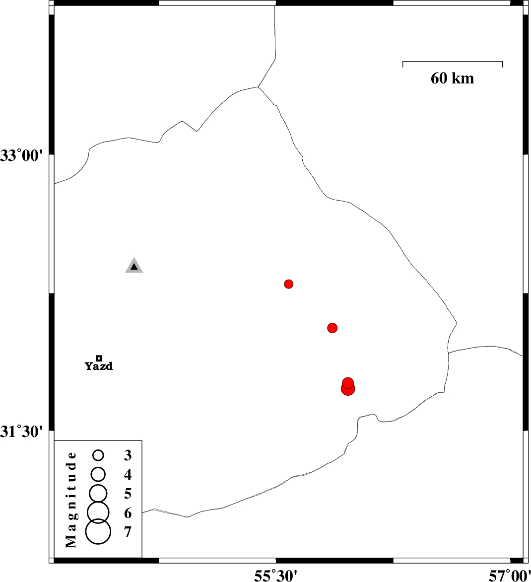 | 2012/07/02 | 12:18:18.1 | 16:48:18.1 | 32.06 | 55.86 | 14 | ML2.8 | Yazd Province, 67 km North-East of Bafq |