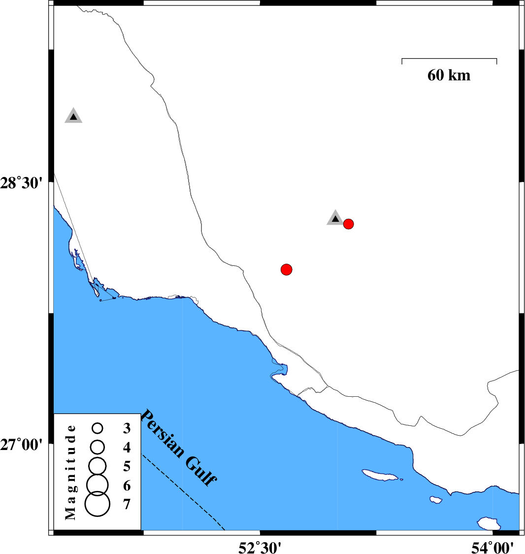 | 2012/07/08 | 15:03:23.8 | 19:33:23.8 | 28 | 52.67 | 16 | ML3.2 | Fars Province, 39 km North-East of Jam | ||
