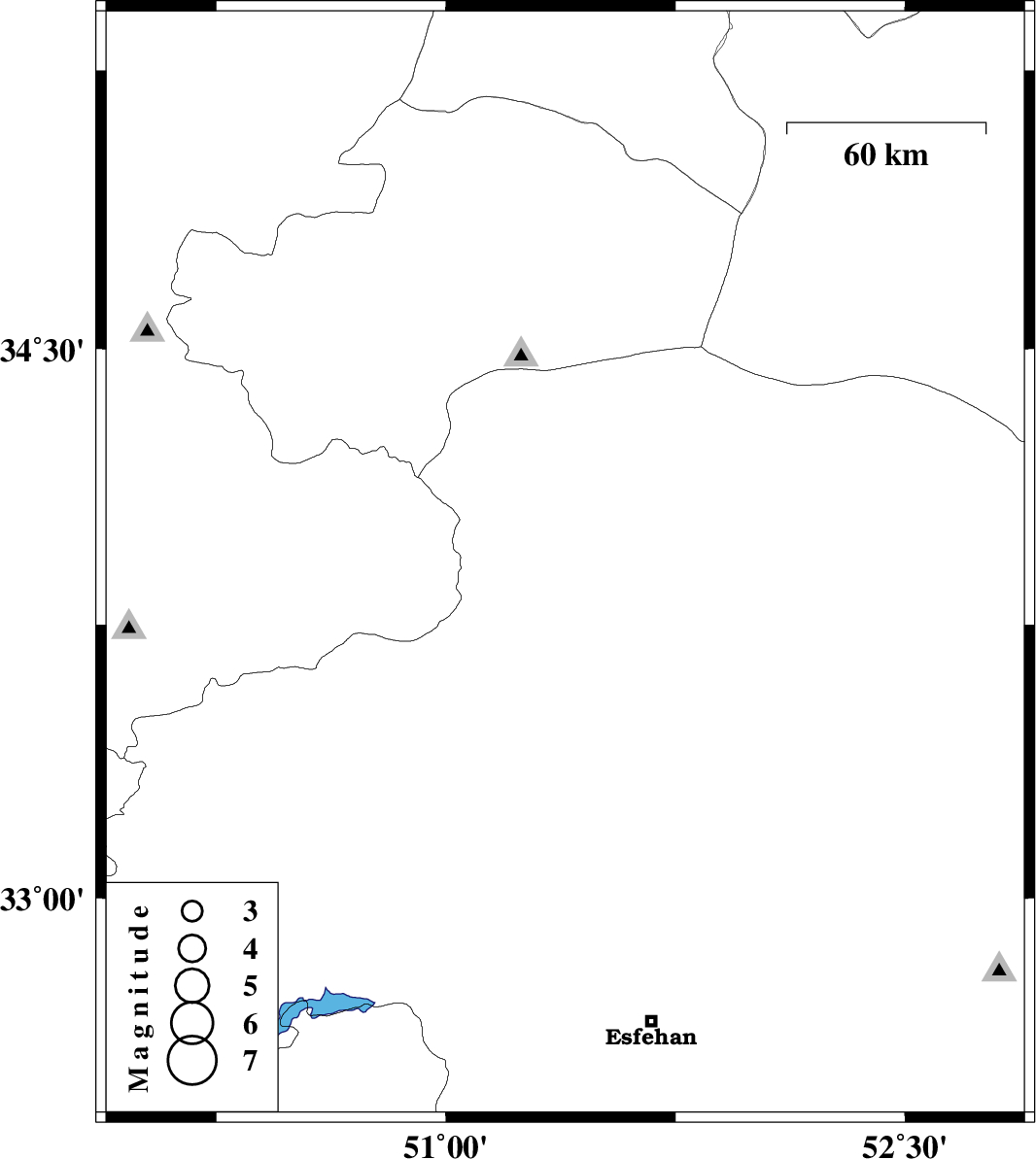 | 2012/07/09 | 08:25:46.1 | 12:55:46.1 | 33.91 | 51.39 | 21 | ML2 | Esfahan Province, 10 km Kashan |