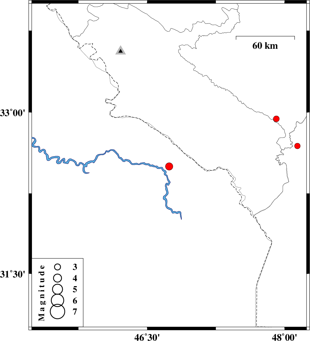 | 2012/07/25 | 13:08:54.5 | 17:38:54.5 | 32.5 | 46.74 | 18 | ML3.7 | Iraq, 53 km South-West of Dehloran | ||