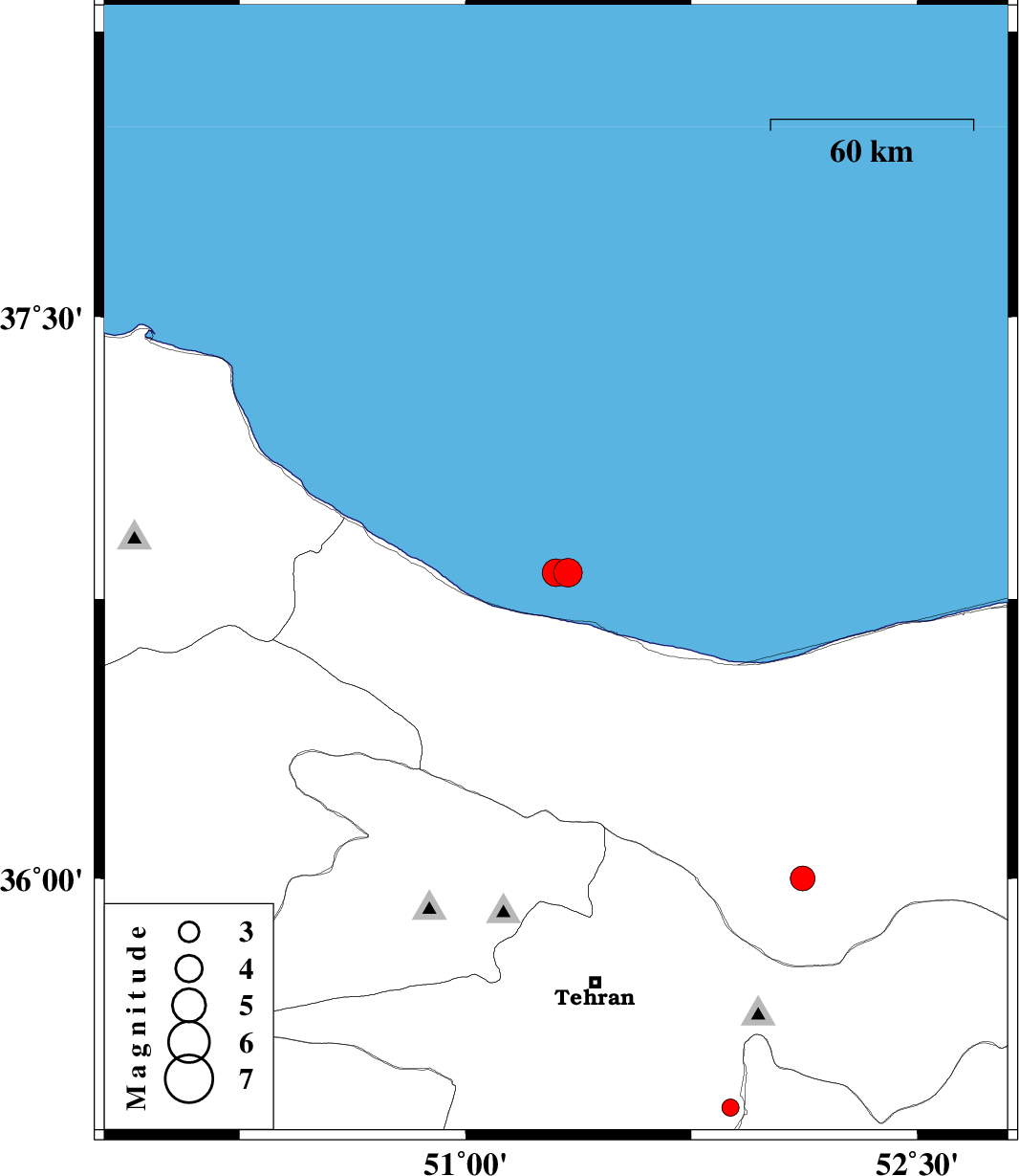 | 2012/07/27 | 21:19:26.9 | 01:49:26.9 | 36.82 | 51.3 | 6 | ML4.1 | Caspian Sea, 22 km North-West of Chalus | ||