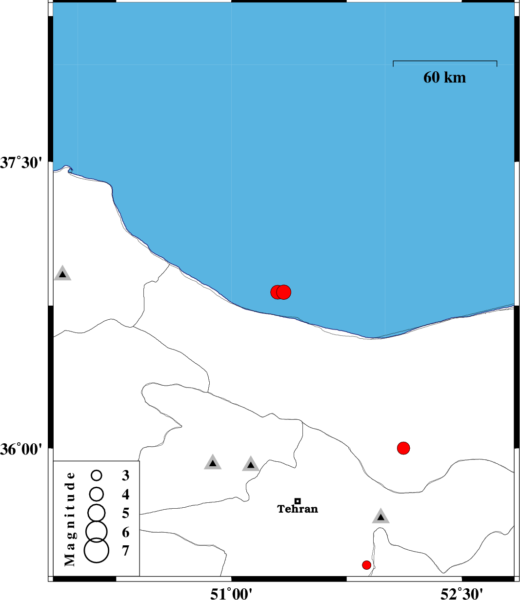 | 2012/07/27 | 21:39:04.5 | 02:09:04.5 | 36.82 | 51.34 | 7 | ML4.2 | Caspian Sea, 20 km North of Chalus | ||