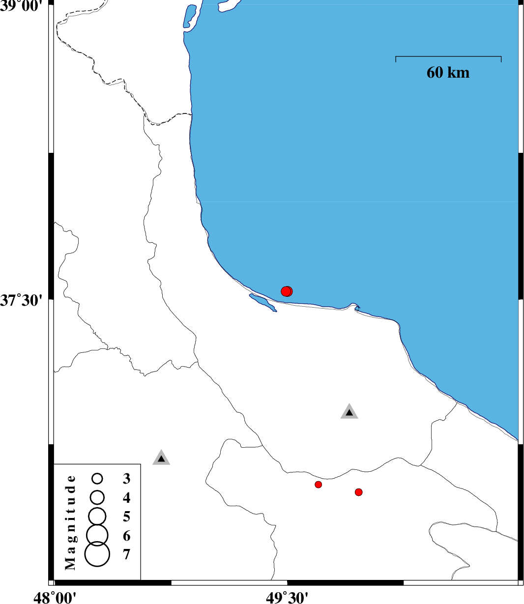 | 2012/07/29 | 03:41:32.9 | 08:11:32.9 | 37.54 | 49.5 | 14 | ML2.9 | Caspian Sea, 8 km Bandar-e anzali | ||