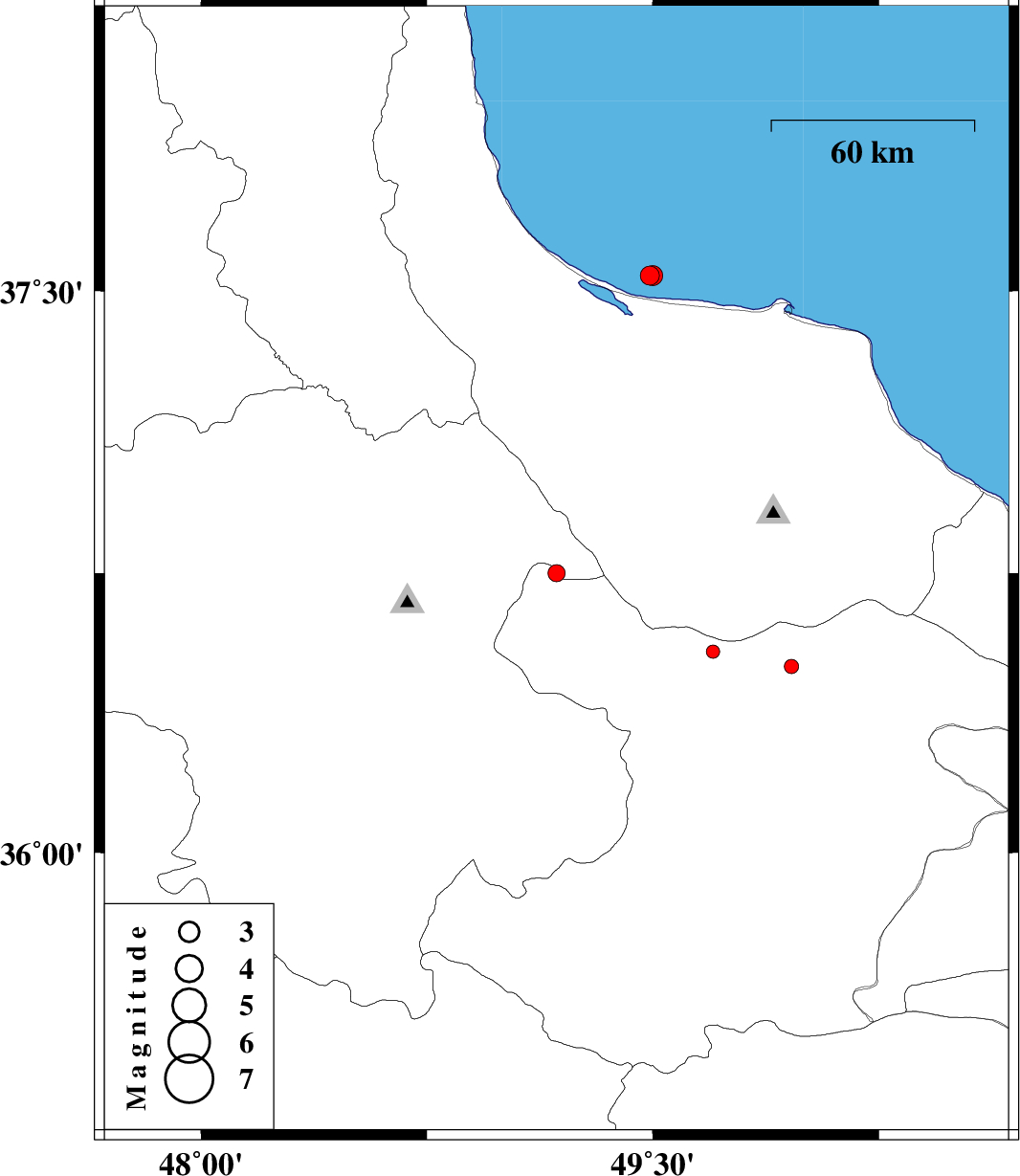 | 2012/07/29 | 04:56:14.9 | 09:26:14.9 | 37.54 | 49.49 | 14 | ML2.8 | Caspian Sea, 7 km Bandar-e anzali | ||