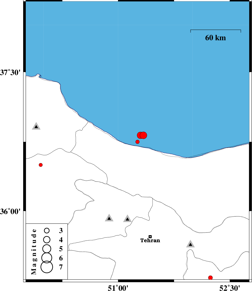 | 2012/07/27 | 21:39:04.5 | 02:09:04.5 | 36.82 | 51.34 | 7 | ML4.2 | Caspian Sea, 20 km North of Chalus | ||