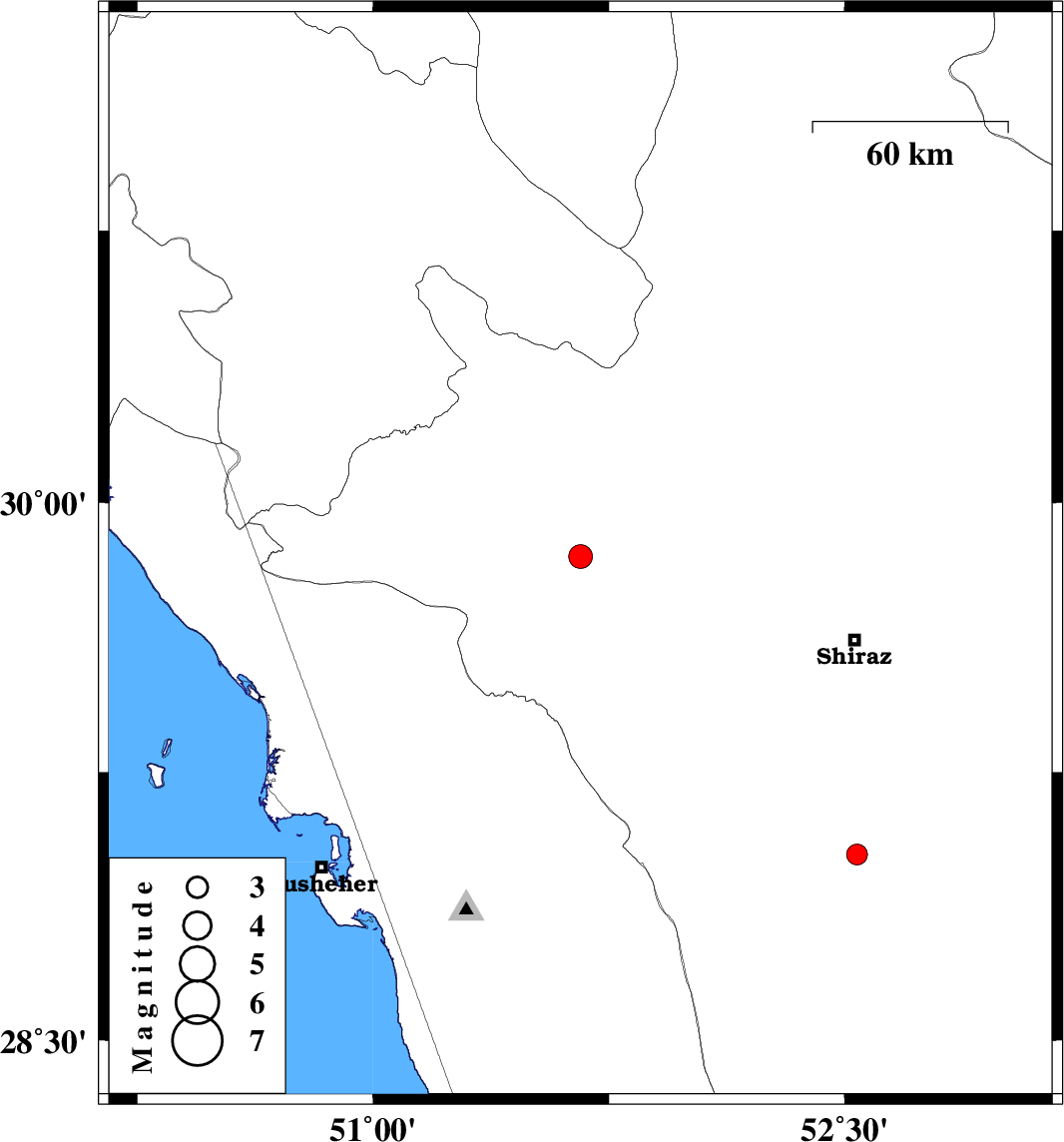 | 2012/08/14 | 13:01:53.3 | 17:31:53.3 | 29.85 | 51.66 | 43 | ML3.4 | Fars Province, 26 km North of Kazerun | ||