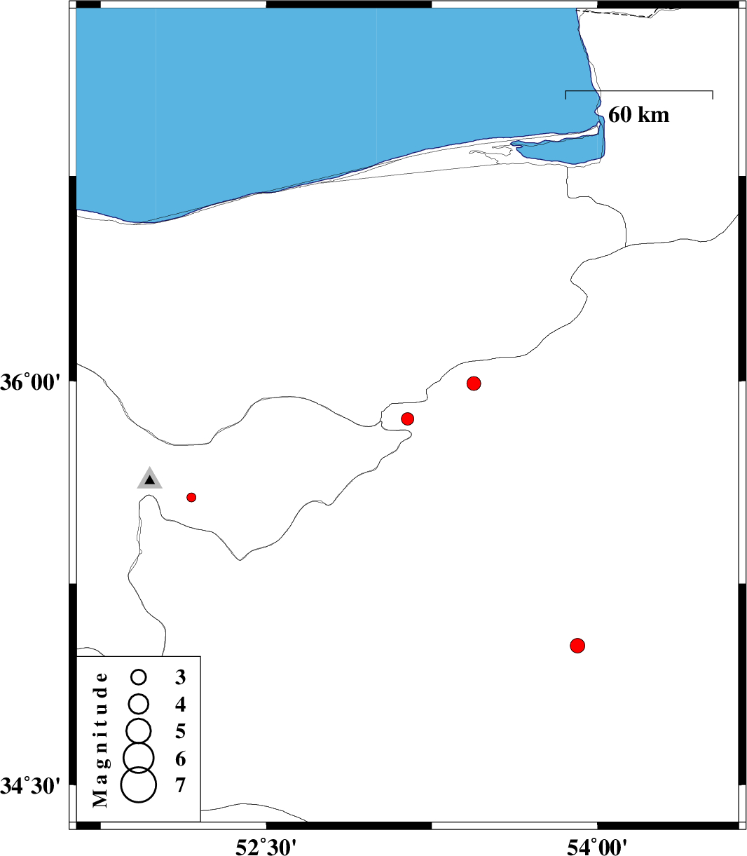 | 2012/08/12 | 19:55:28.5 | 00:25:28.5 | 35.99 | 53.44 | 45 | ML2.8 | Semnan Province, 47 km North of Semnan |