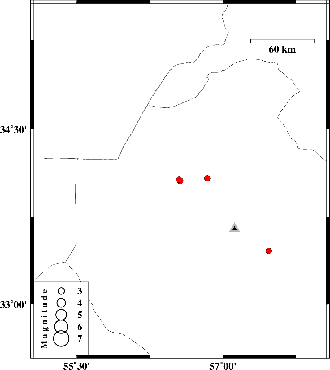 | 2012/08/09 | 11:06:40.6 | 15:36:40.6 | 33.46 | 57.47 | 11 | ML2.7 | Yazd Province, 53 km South-East of Tabas | ||