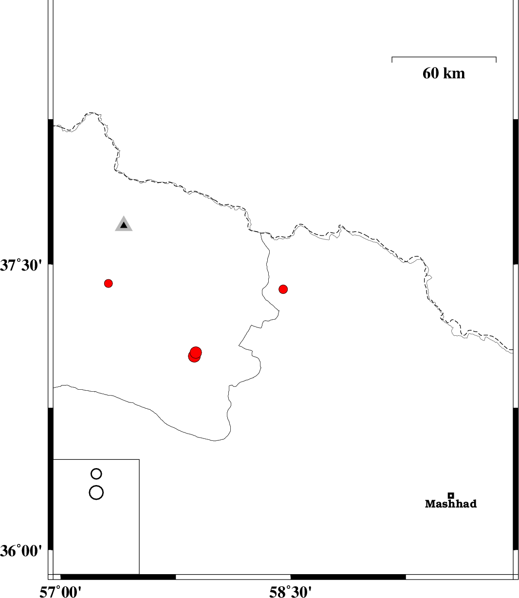 | 2012/08/27 | 15:40:16.3 | 20:10:16.3 | 37.37 | 58.45 | 14 | ML2.6 | Khorasan(center) Province, 29 km North of Quchan | ||