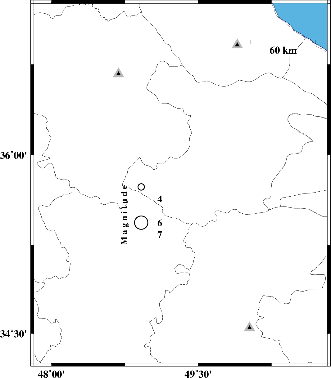 | 2012/08/30 | 20:10:36.7 | 00:40:36.7 | 35.75 | 49.32 | 14 | ML2 | Ghazvin Province, 44 km South of Abhar | ||