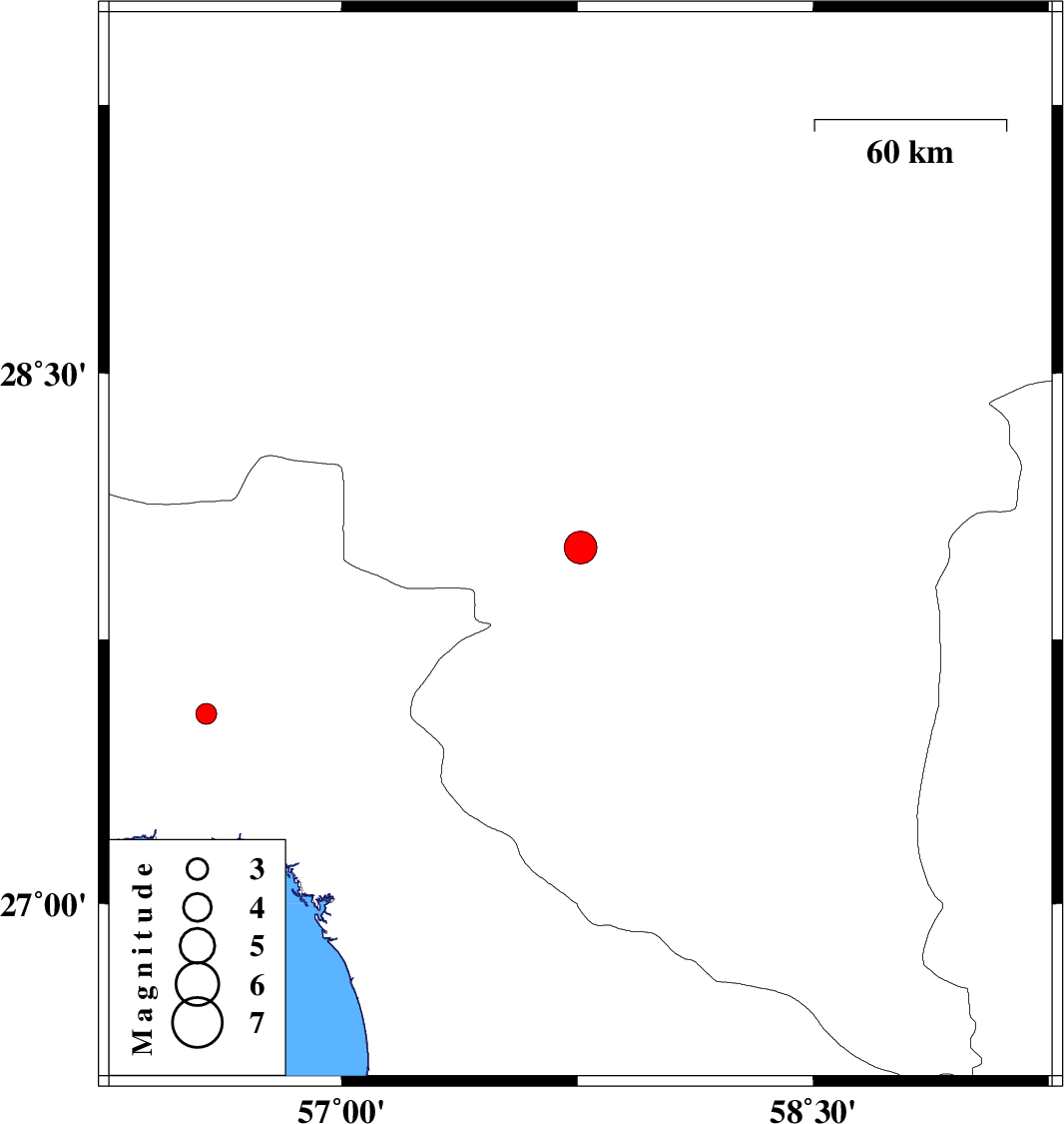 | 2012/08/31 | 09:30:46.1 | 14:00:46.1 | 27.54 | 56.57 | 14 | ML3 | Hormozgan Province, 49 km North-East of Bandar-e abbas |