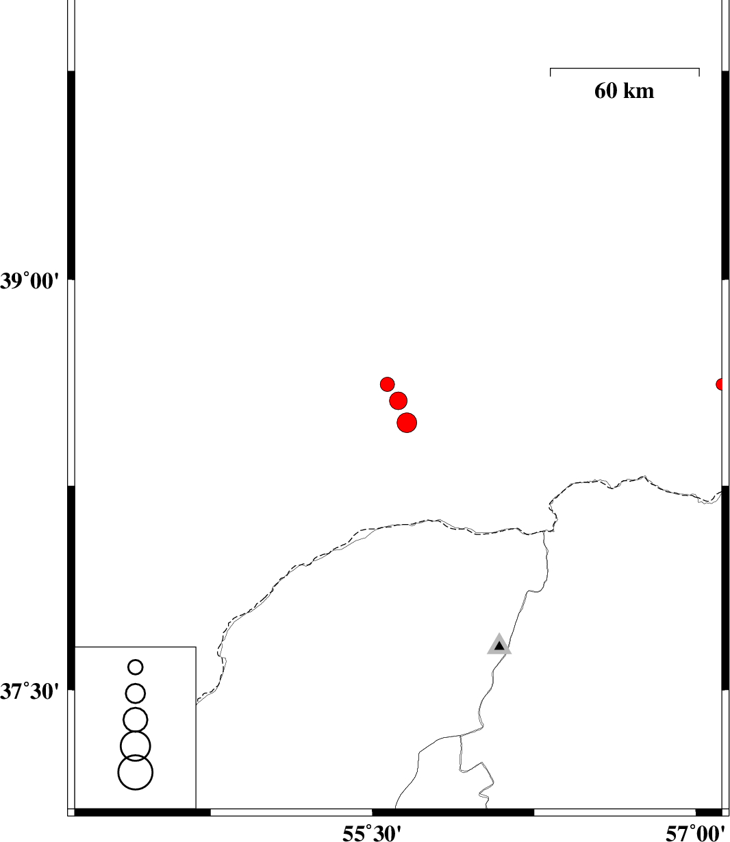 | 2012/09/09 | 16:37:10.9 | 21:07:10.9 | 37.19 | 54.16 | 16 | ML2.9 | Golestan Province, 33 km North of Bandar-e torkaman | ||