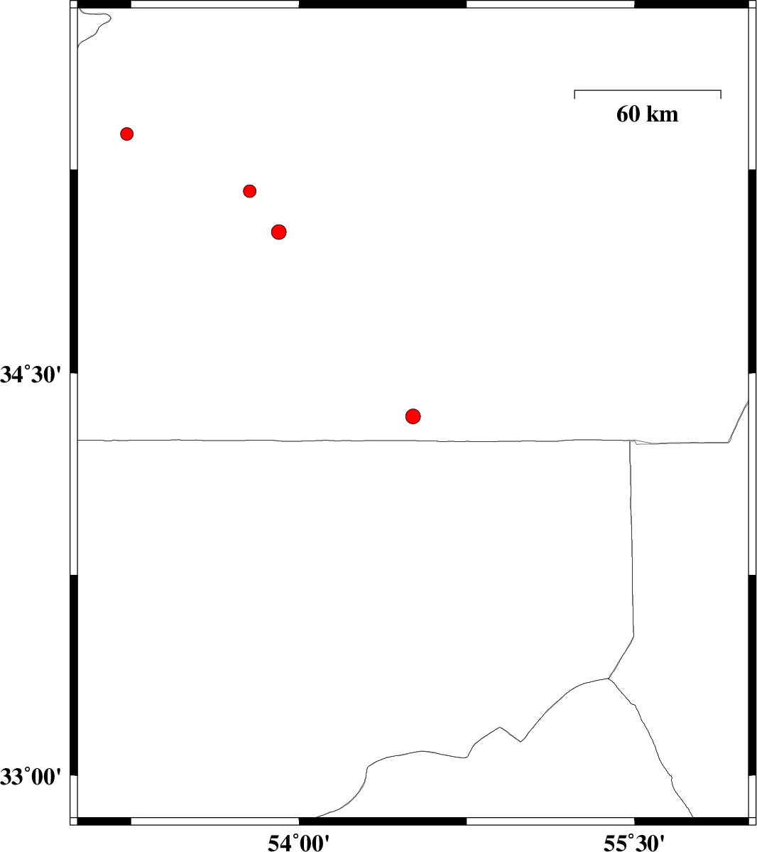 | 2012/09/12 | 10:19:48.7 | 14:49:48.7 | 34.34 | 54.51 | 16 | ML2.9 | Semnan Province, 204 km South-East of Damghan | ||
