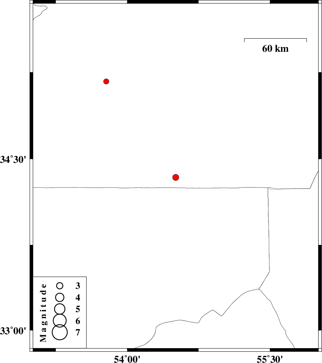 | 2012/09/12 | 10:19:48.7 | 14:49:48.7 | 34.34 | 54.51 | 16 | ML2.9 | Semnan Province, 204 km South-East of Damghan | ||