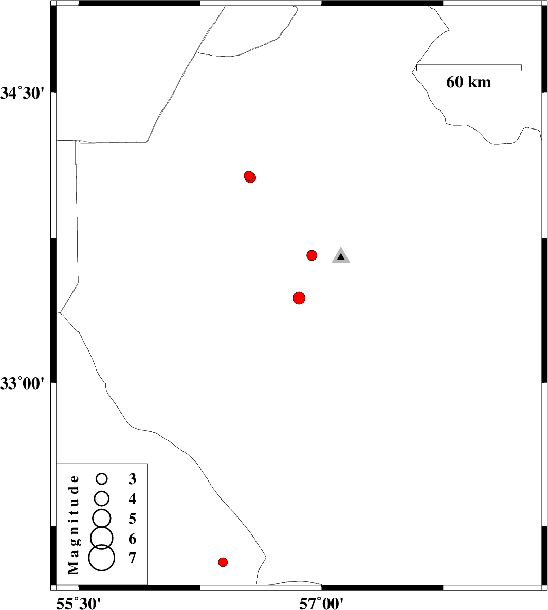 | 2012/09/13 | 20:26:08.4 | 00:56:08.4 | 33.44 | 56.86 | 14 | ML3.4 | Yazd Province, 19 km South of Tabas | ||