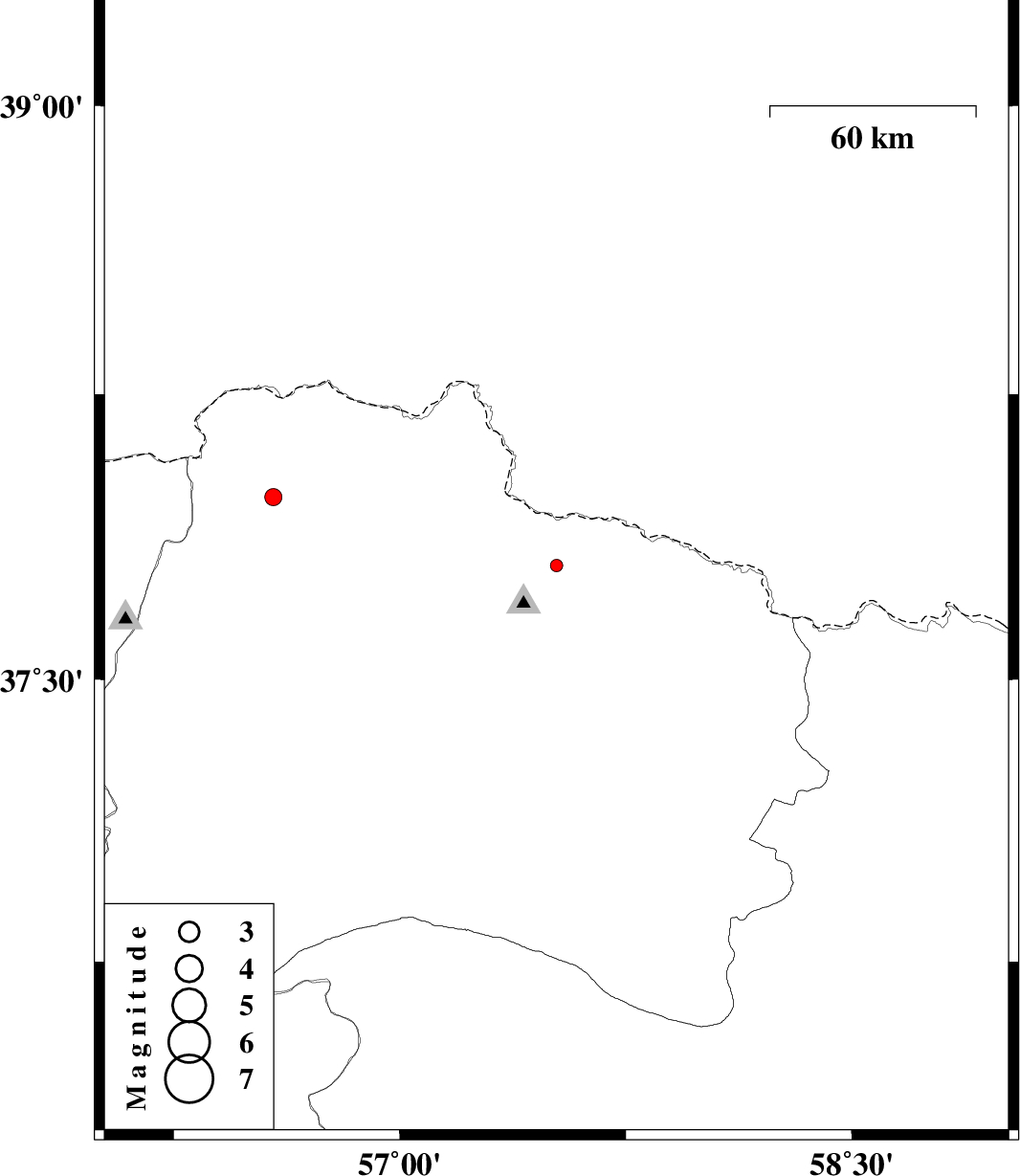 | 2012/10/01 | 00:39:17.6 | 04:09:17.6 | 37.8 | 57.52 | 14 | ML1.9 | Khorasan(north) Province, 40 km North-East of Bojnurd |