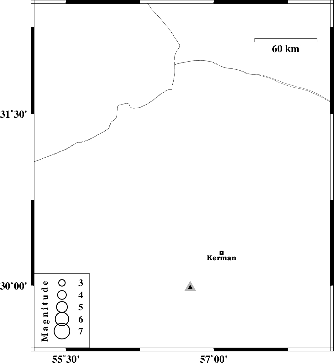 | 2012/10/05 | 03:16:23.1 | 06:46:23.1 | 30.95 | 56.68 | 15 | ML3 | Kerman Province, 19 km North-East of Zarand |