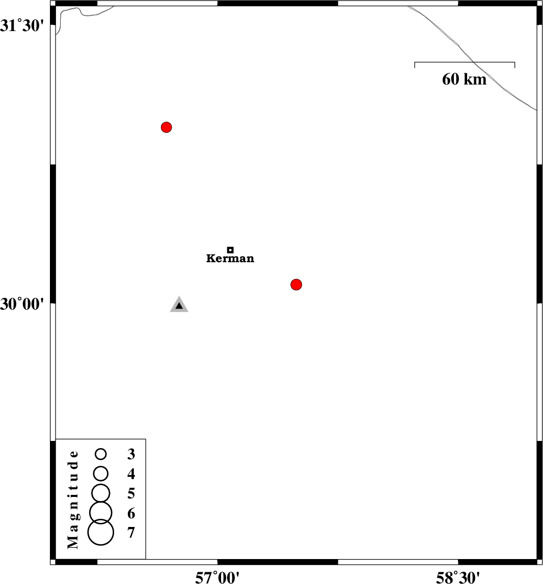 | 2012/10/05 | 03:16:23.1 | 06:46:23.1 | 30.95 | 56.68 | 15 | ML3 | Kerman Province, 19 km North-East of Zarand |