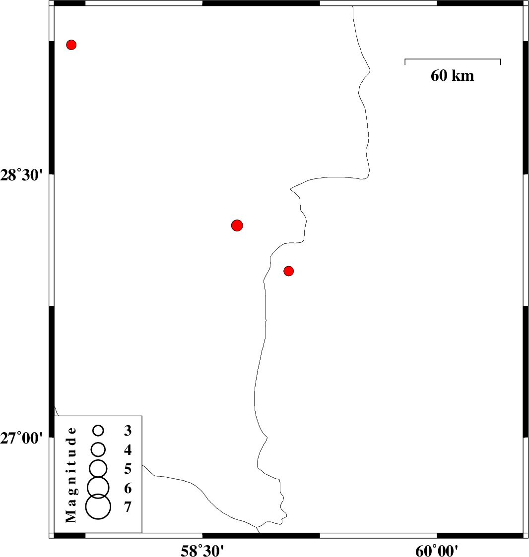 | 2012/10/07 | 20:20:09.6 | 23:50:09.6 | 27.95 | 59.05 | 14 | ML2.8 | Sistan va Baloochestan Province, 133 km East of Kahnuj | ||