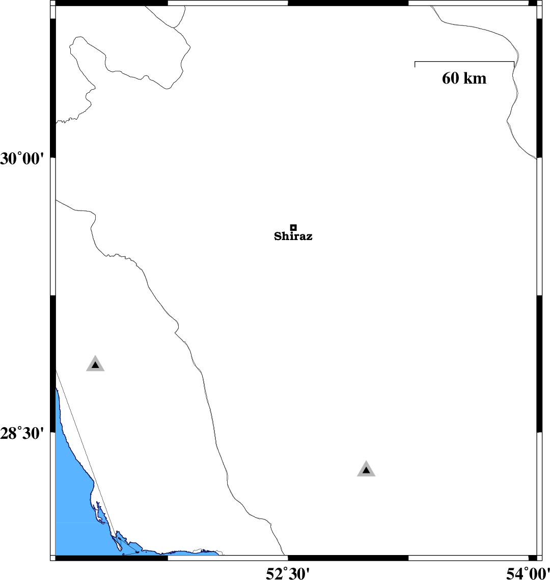 | 2012/10/09 | 01:53:44.7 | 05:23:44.7 | 29.5 | 52.01 | 17 | ML3.6 | Fars Province, 37 km South-East of Kazerun |