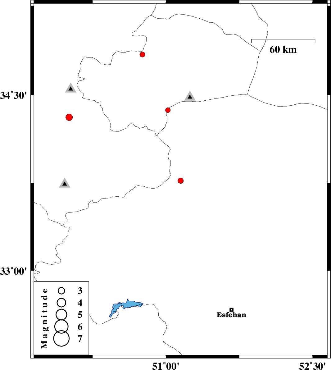 | 2012/10/14 | 16:44:02.6 | 20:14:02.6 | 33.77 | 51.15 | 14 | ML2.6 | Esfahan Province, 37 km South-West of Kashan | ||