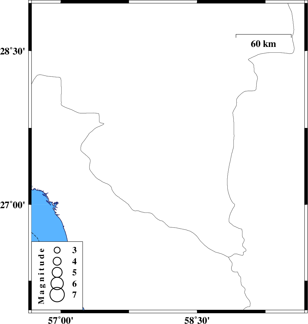 | 2012/10/16 | 23:43:53.5 | 03:13:53.5 | 27.46 | 58.18 | 14 | ML3.5 | Kerman Province, 67 km East of Manujan |