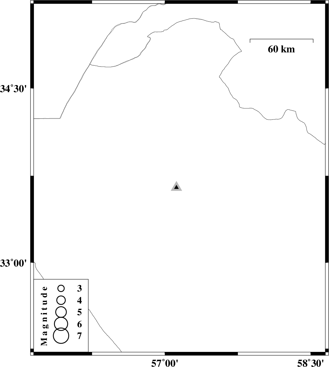| 2012/10/19 | 04:28:15.9 | 07:58:15.9 | 33.72 | 57.15 | 14 | ML2.3 | Yazd Province, 25 km North-East of Tabas |