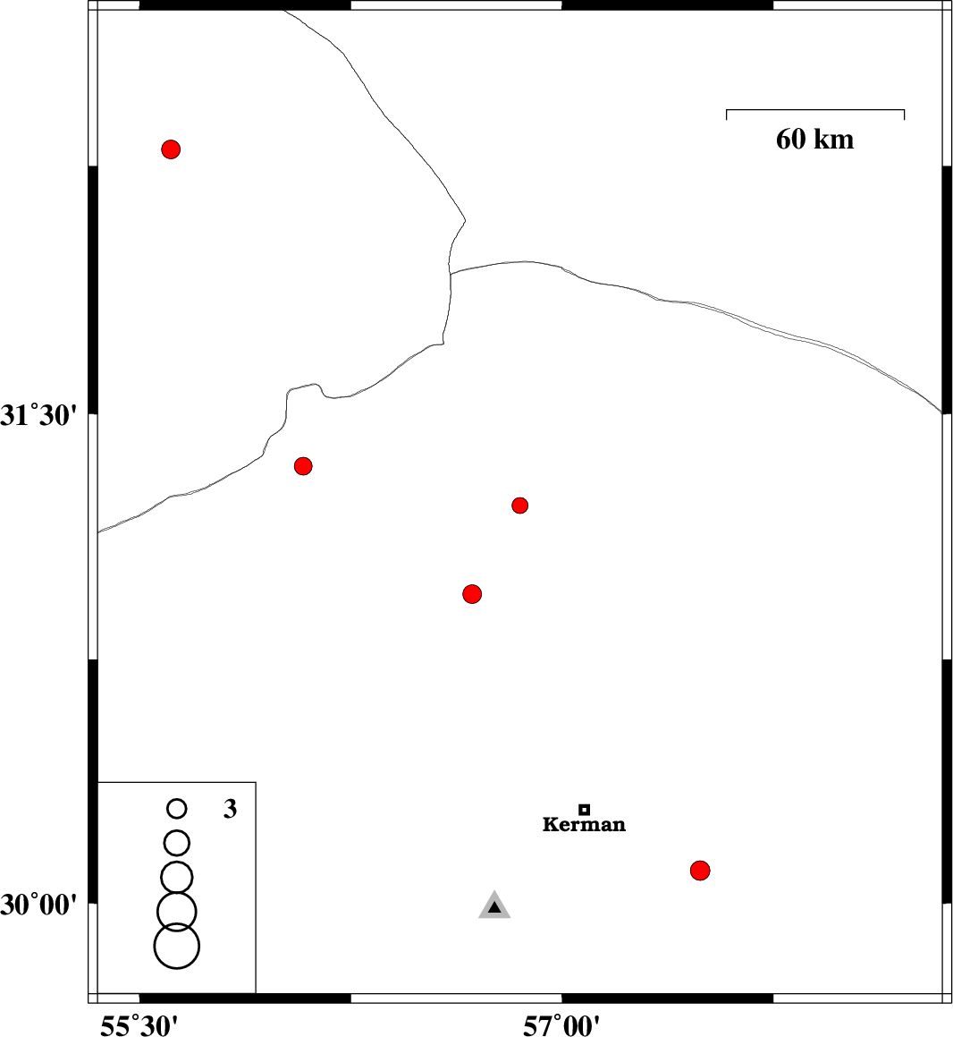 | 2012/09/26 | 09:49:43.3 | 13:19:43.3 | 31.34 | 56.08 | 46 | ML2.8 | Kerman Province, 70 km West of Ravar |