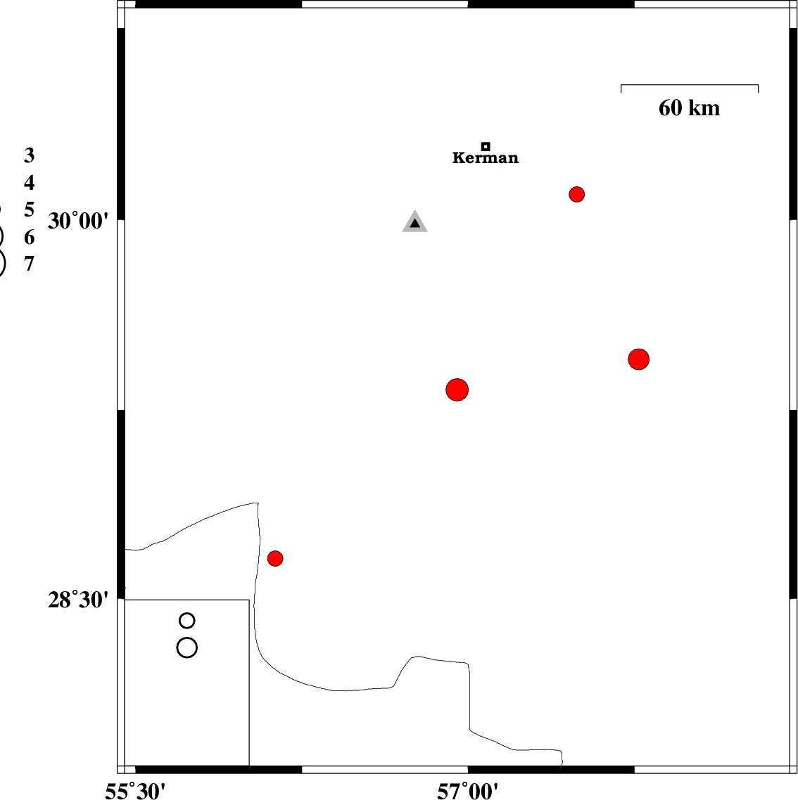 | 2012/10/06 | 00:16:14.9 | 03:46:14.9 | 30.1 | 57.49 | 15 | ML3.1 | Kerman Province, 45 km South-East of Kerman |