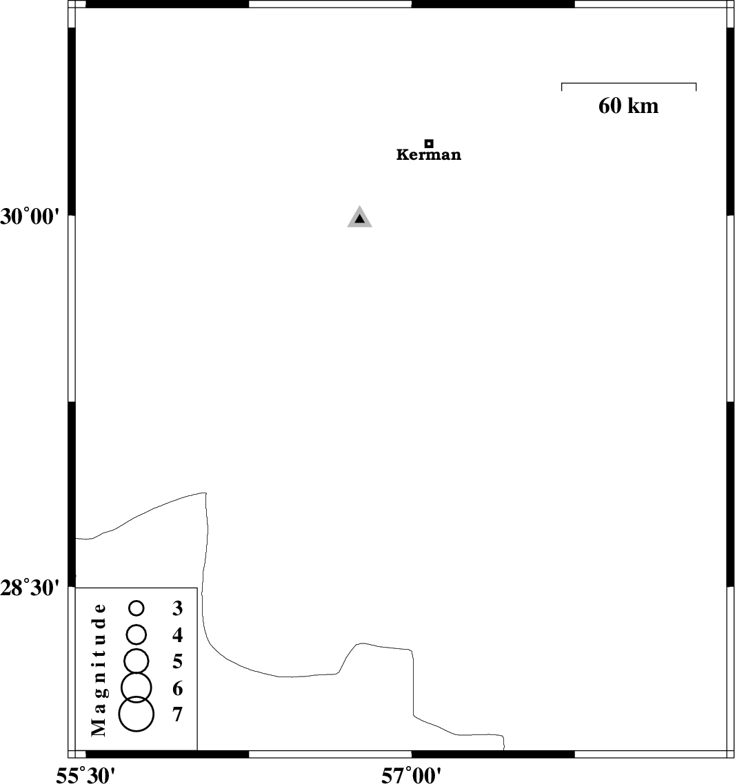 | 2012/10/27 | 20:54:54.8 | 00:24:54.8 | 29.33 | 56.95 | 15 | ML4.5 | Kerman Province, 35 km East of Baft |