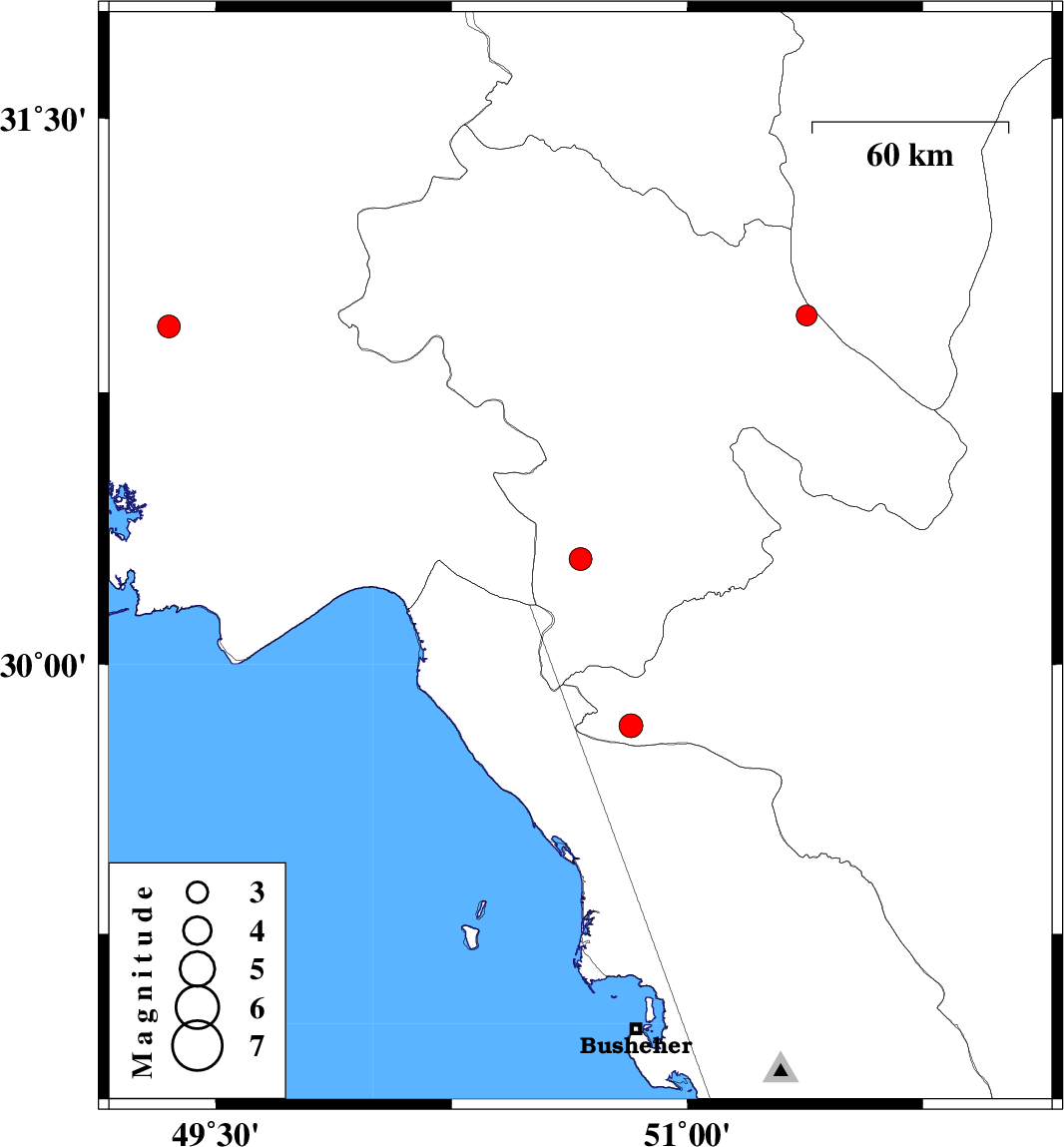| 2012/10/25 | 07:39:41.4 | 11:09:41.4 | 30.93 | 49.35 | 15 | ML3.3 | Khoozestan Province, 39 km North-West of Omidiyeh |