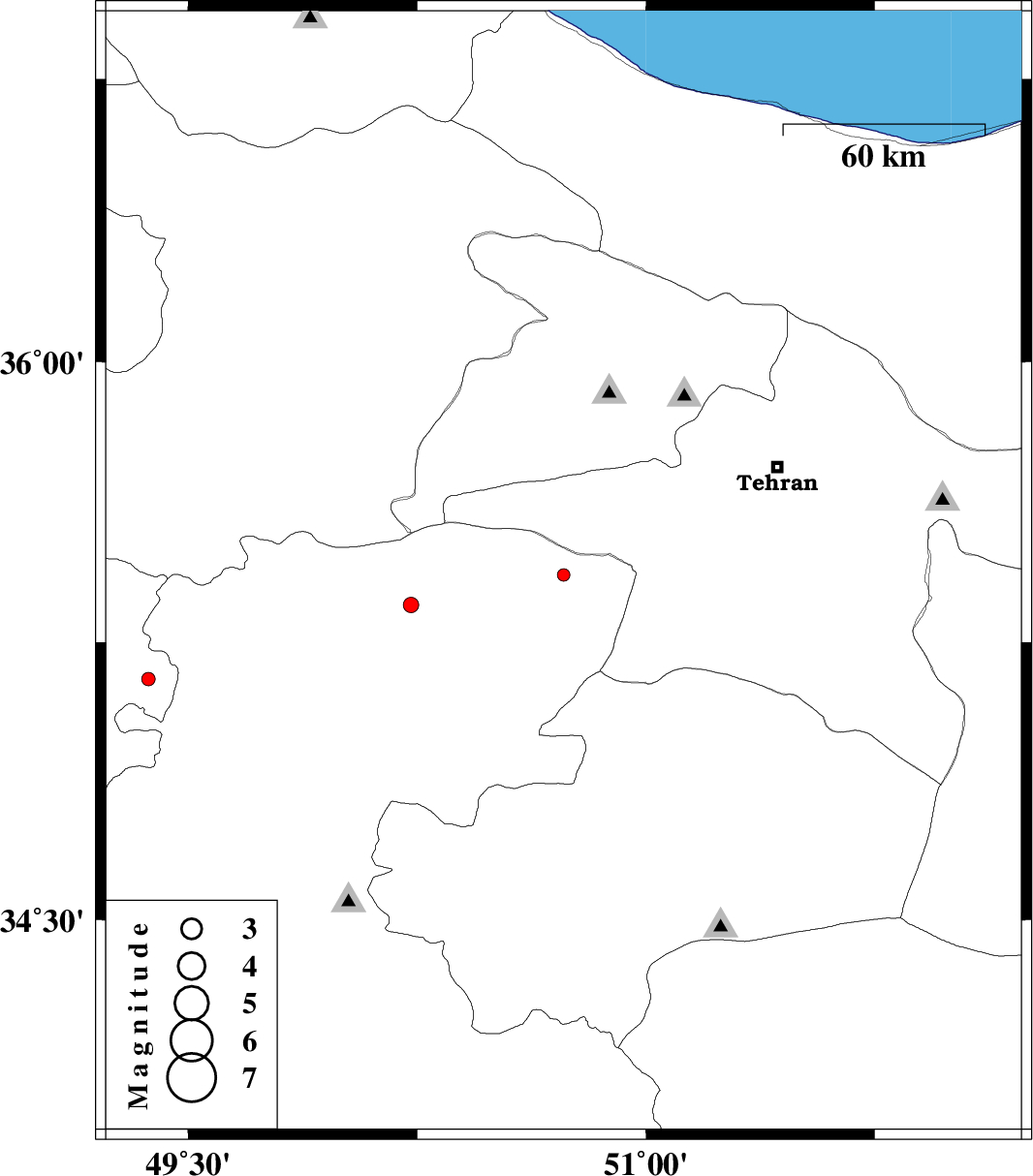 | 2012/10/31 | 09:21:58.2 | 12:51:58.2 | 35.15 | 49.37 | 15 | ML2 | Hamedan Province, 40 km South-East of Razan |