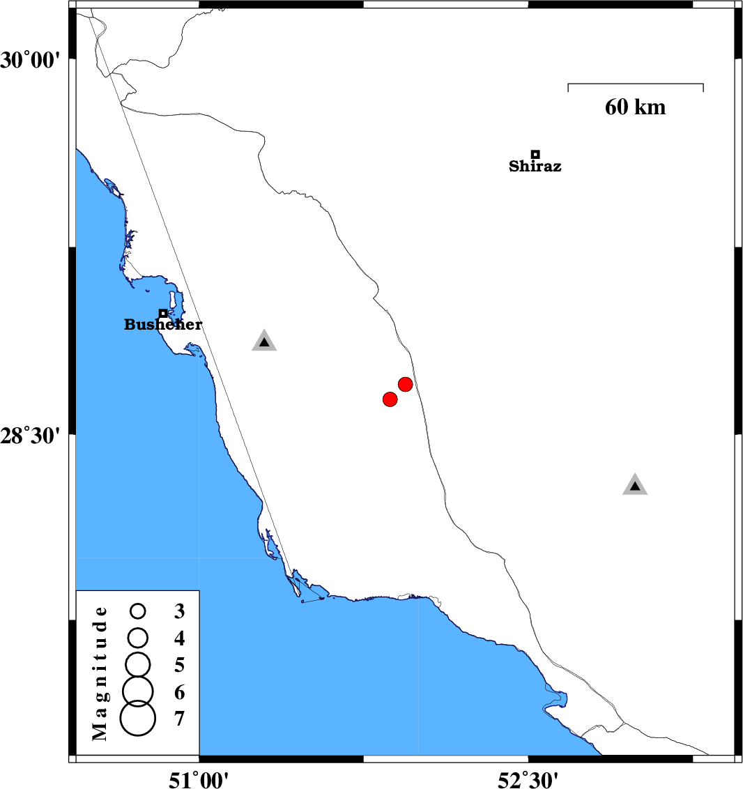 | 2012/11/10 | 01:46:16.0 | 05:16:16.0 | 28.64 | 51.87 | 28 | ML3 | Bushehr Province, 33 km South-West of Farashband |