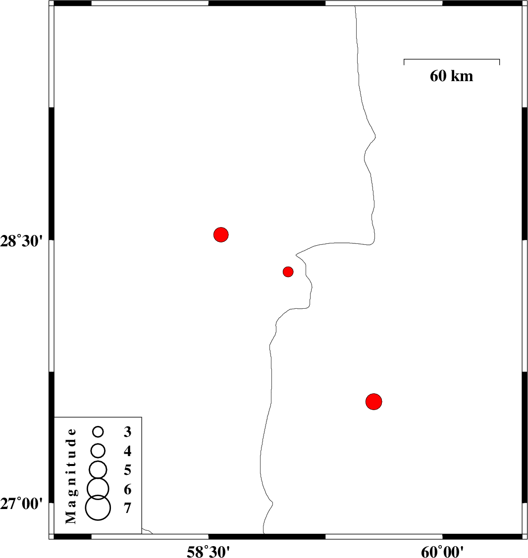 | 2012/10/21 | 16:38:24.1 | 20:08:24.1 | 27.58 | 59.56 | 15 | ML4.7 | Sistan va Baloochestan Province, 119 km North-West of Iranshahr |