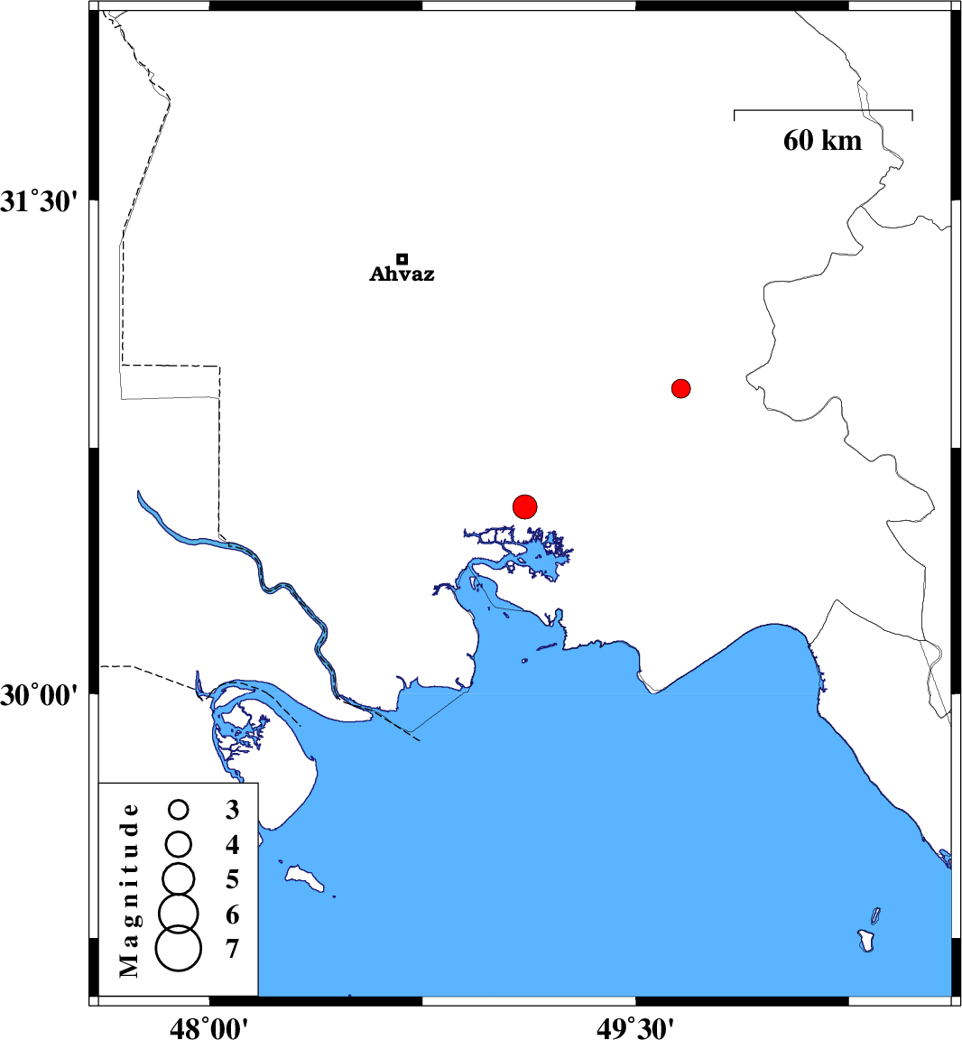 | 2012/11/22 | 16:26:48.4 | 19:56:48.4 | 30.93 | 49.66 | 18 | ML3 | Khoozestan Province, 19 km North of Omidiyeh |