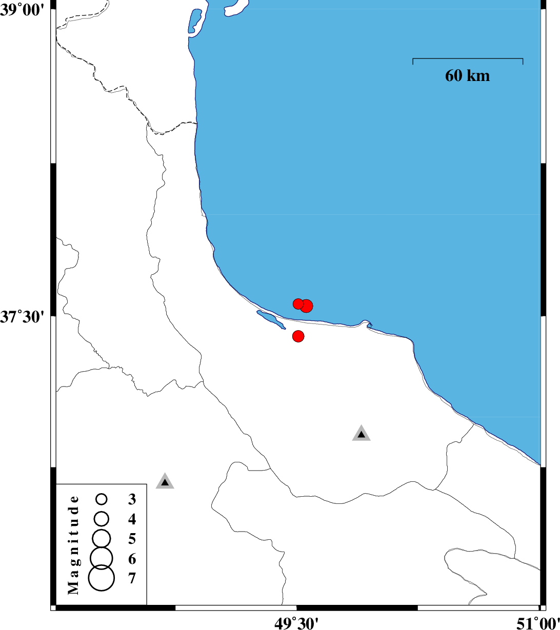 | 2012/12/11 | 09:47:18.7 | 13:17:18.7 | 37.56 | 49.51 | 14 | ML2.9 | Caspian Sea, 11 km Bandar-e anzali | ||