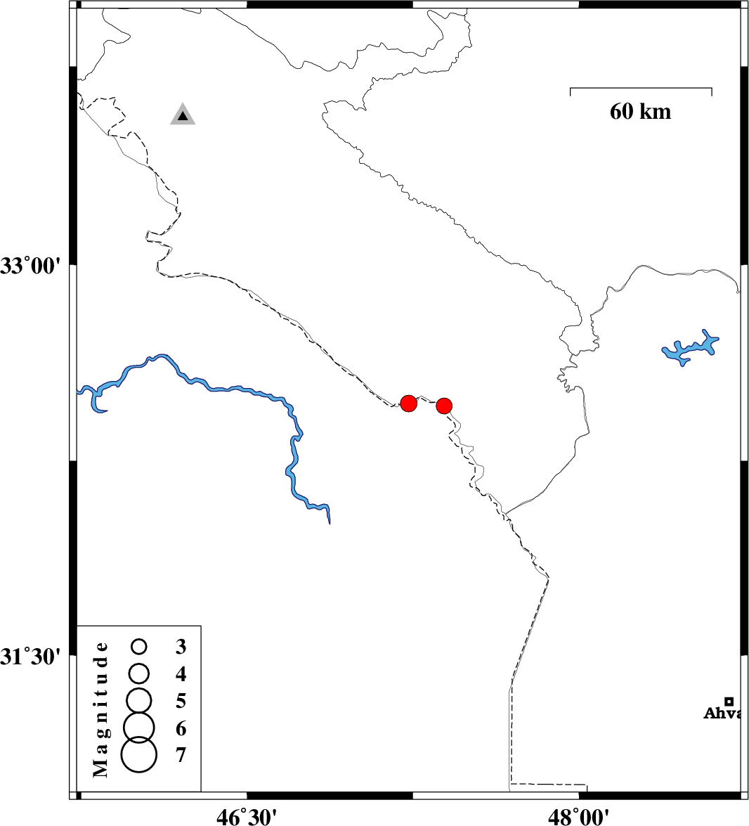 | 2012/12/12 | 02:13:30.5 | 05:43:30.5 | 32.46 | 47.39 | 36 | ML3.2 | 28 km South-East of Dehloran |