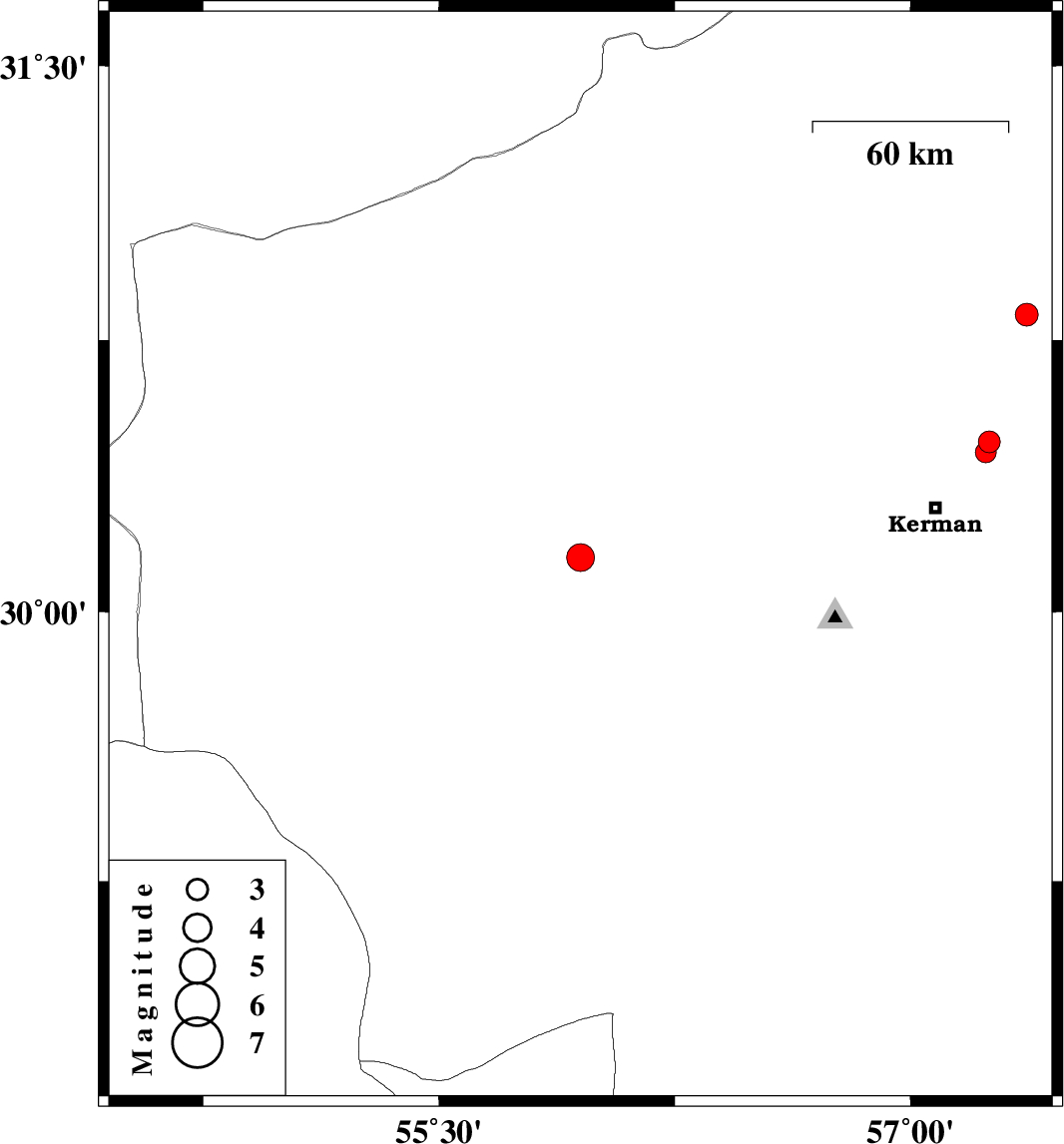 | 2012/12/06 | 05:22:32.7 | 08:52:32.7 | 30.82 | 57.37 | 14 | ML3.2 | Kerman Province, 77 km East of Zarand |