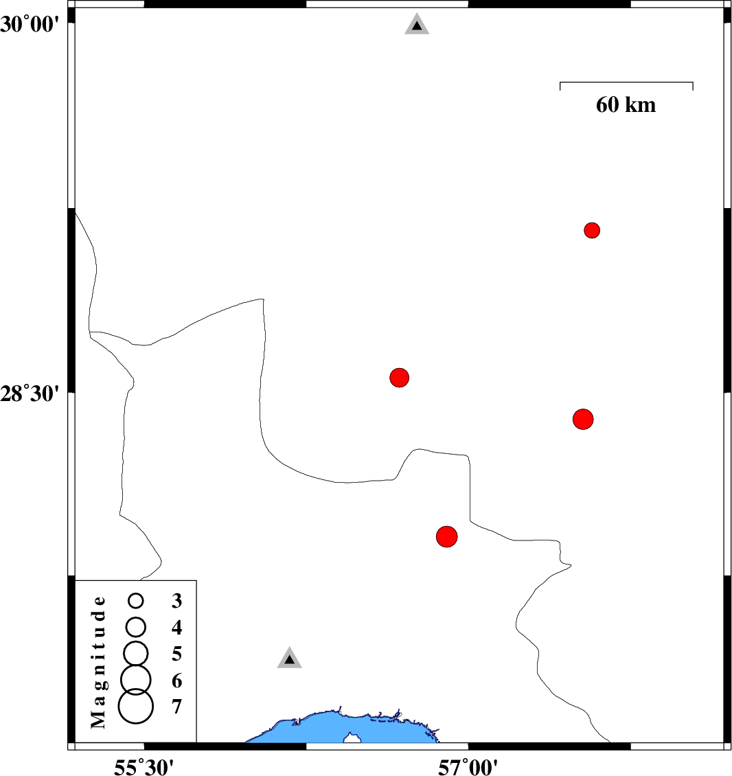 | 2012/12/14 | 10:10:27.4 | 13:40:27.4 | 28.39 | 57.53 | 14 | ML4.3 | Kerman Province, 37 km South-West of Jiroft | ||
