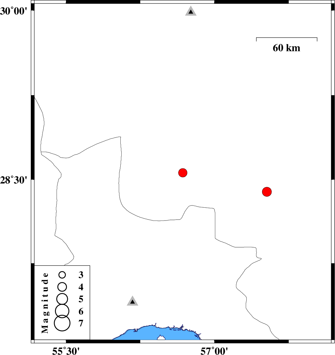 | 2012/12/18 | 02:53:53.9 | 06:23:53.9 | 28.56 | 56.68 | 14 | ML4 | Kerman Province, 75 km South of Baft | ||