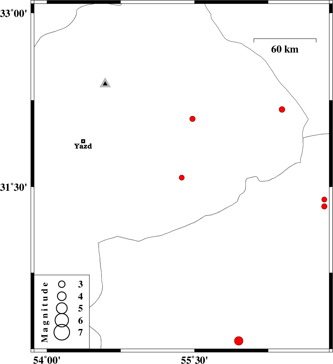 | 2012/12/05 | 07:43:12.9 | 11:13:12.9 | 31.39 | 56.82 | 14 | ML2.4 | Kerman Province, 14 km North of Ravar | ||