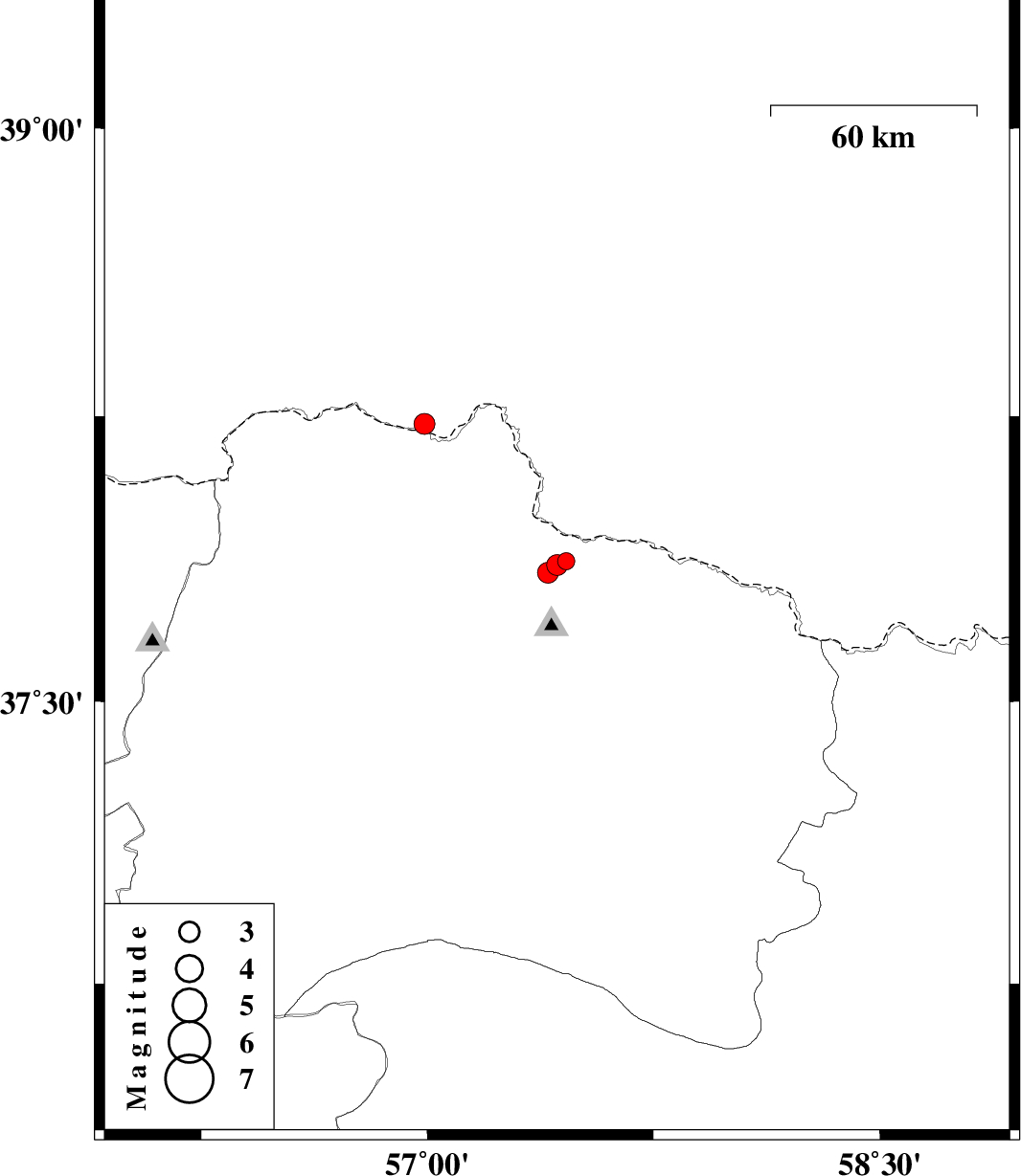 | 2012/12/23 | 16:30:58.7 | 20:00:58.7 | 37.84 | 57.4 | 6 | ML3.1 | Khorasan(north) Province, 41 km North of Bojnurd | ||