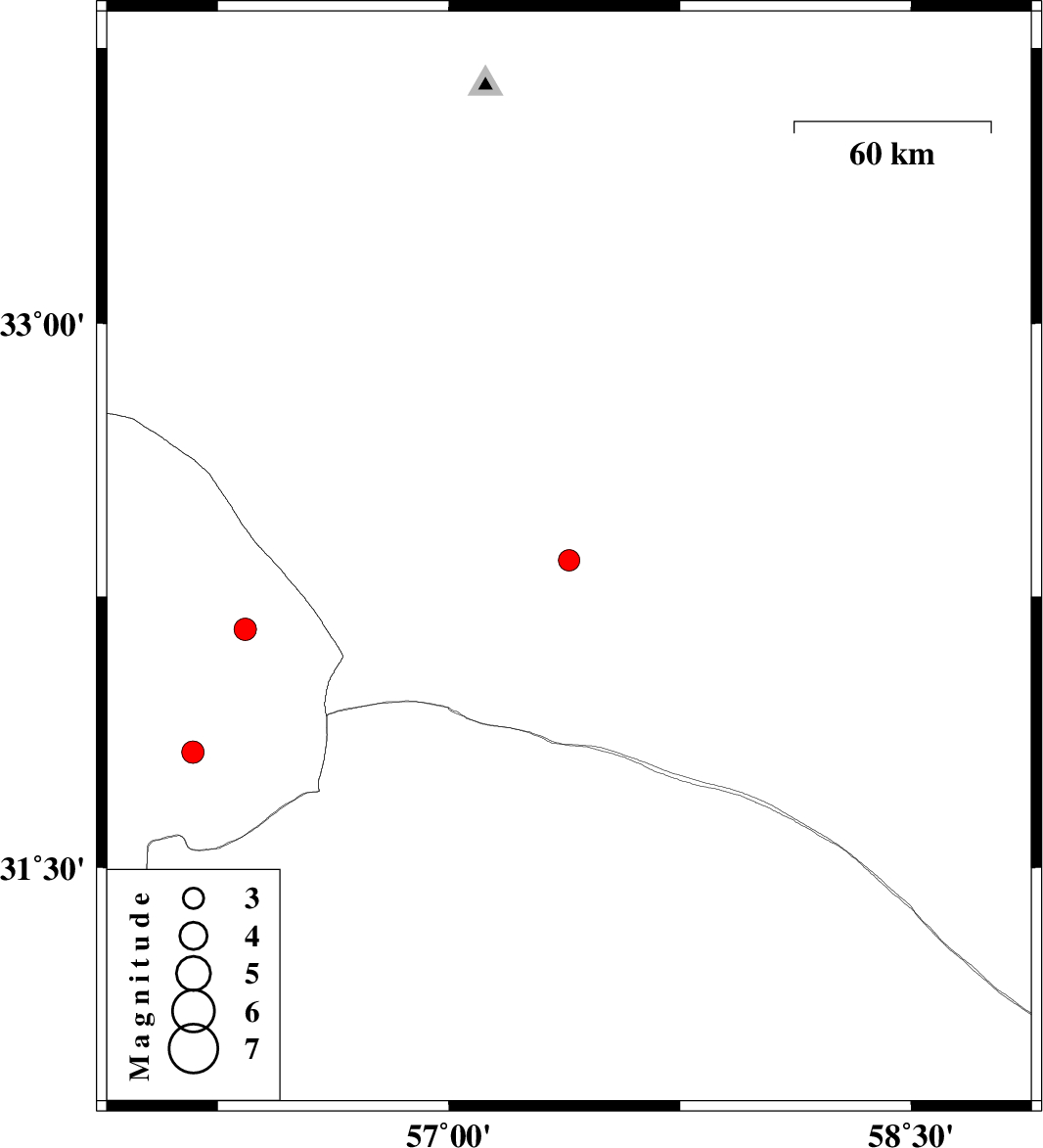 | 2012/12/28 | 19:45:36.4 | 23:15:36.4 | 32.16 | 56.34 | 18 | ML3.2 | Yazd Province, 109 km North-West of Ravar |