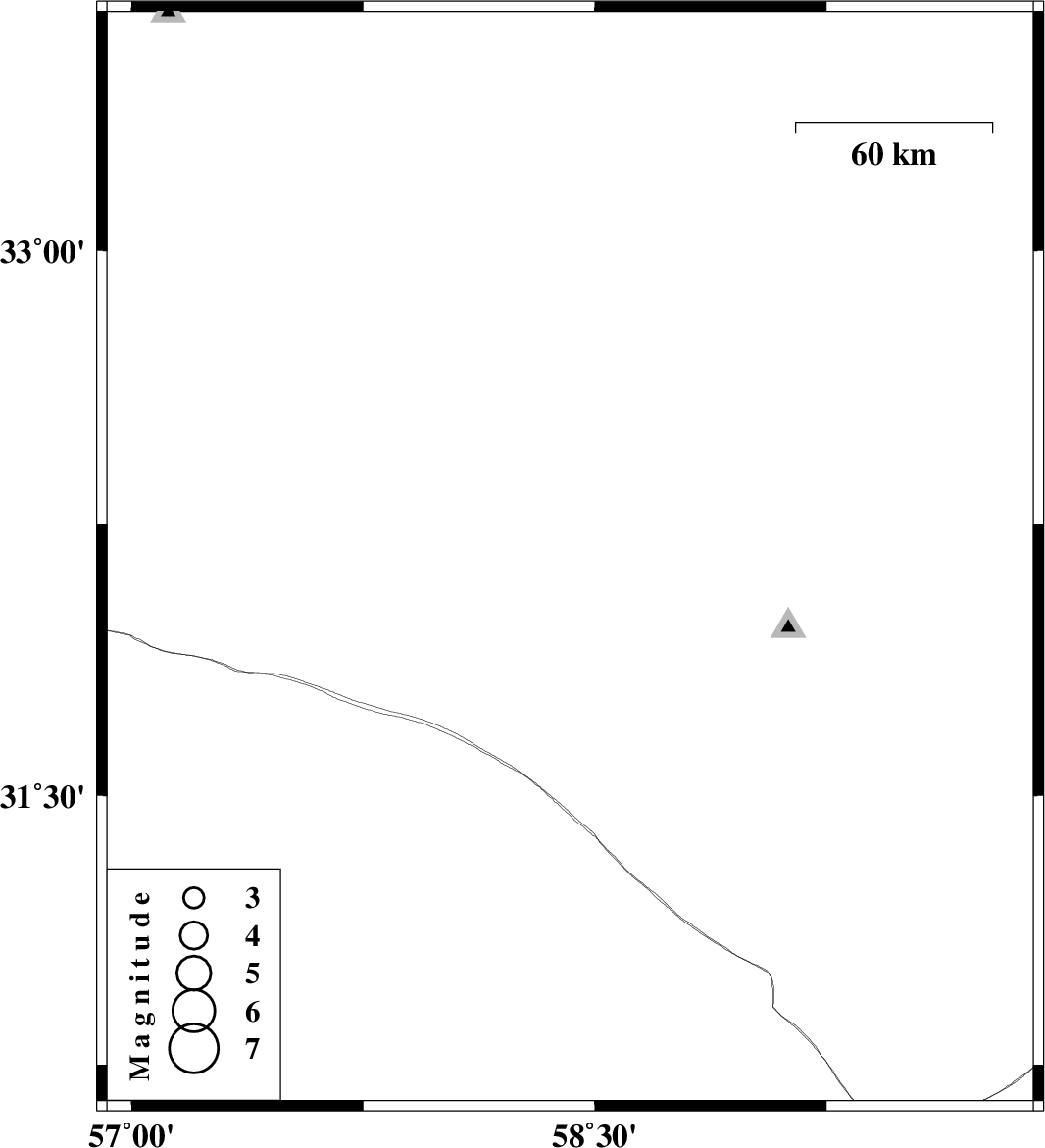 | 2013/01/06 | 12:31:57.4 | 16:01:57.4 | 32.15 | 58.42 | 16 | ML3.3 | Khorasan(south) Province, 113 km South-West of Birjand |