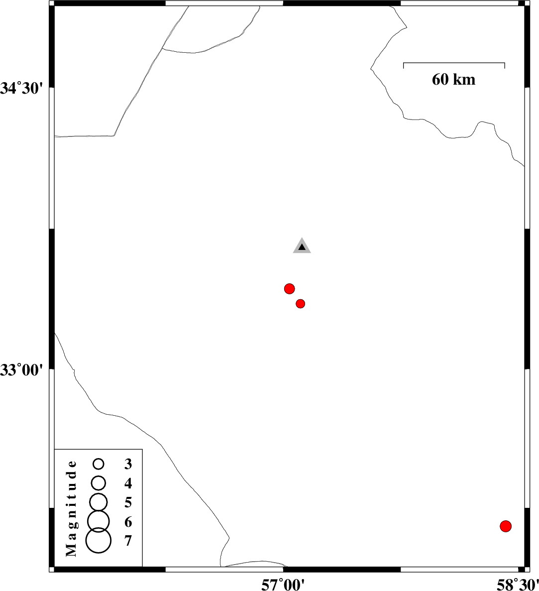 | 2013/01/06 | 12:31:57.4 | 16:01:57.4 | 32.15 | 58.42 | 16 | ML3.3 | Khorasan(south) Province, 113 km South-West of Birjand |