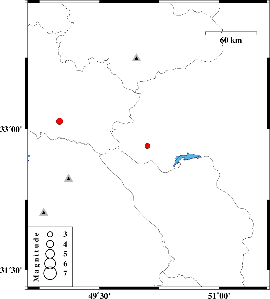 | 2013/01/10 | 18:32:55.4 | 22:02:55.4 | 32.82 | 50.1 | 17 | ML3 | Esfahan Province, 13 km South of Fereydunshahr | ||